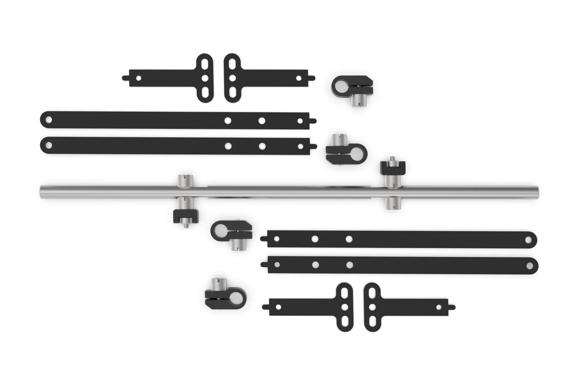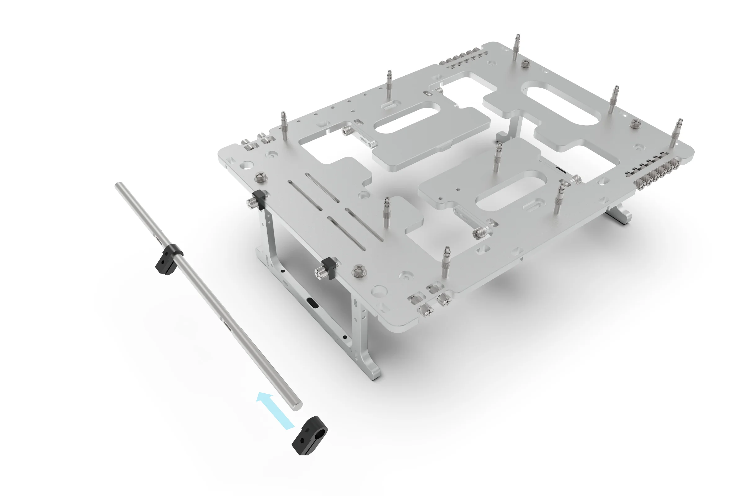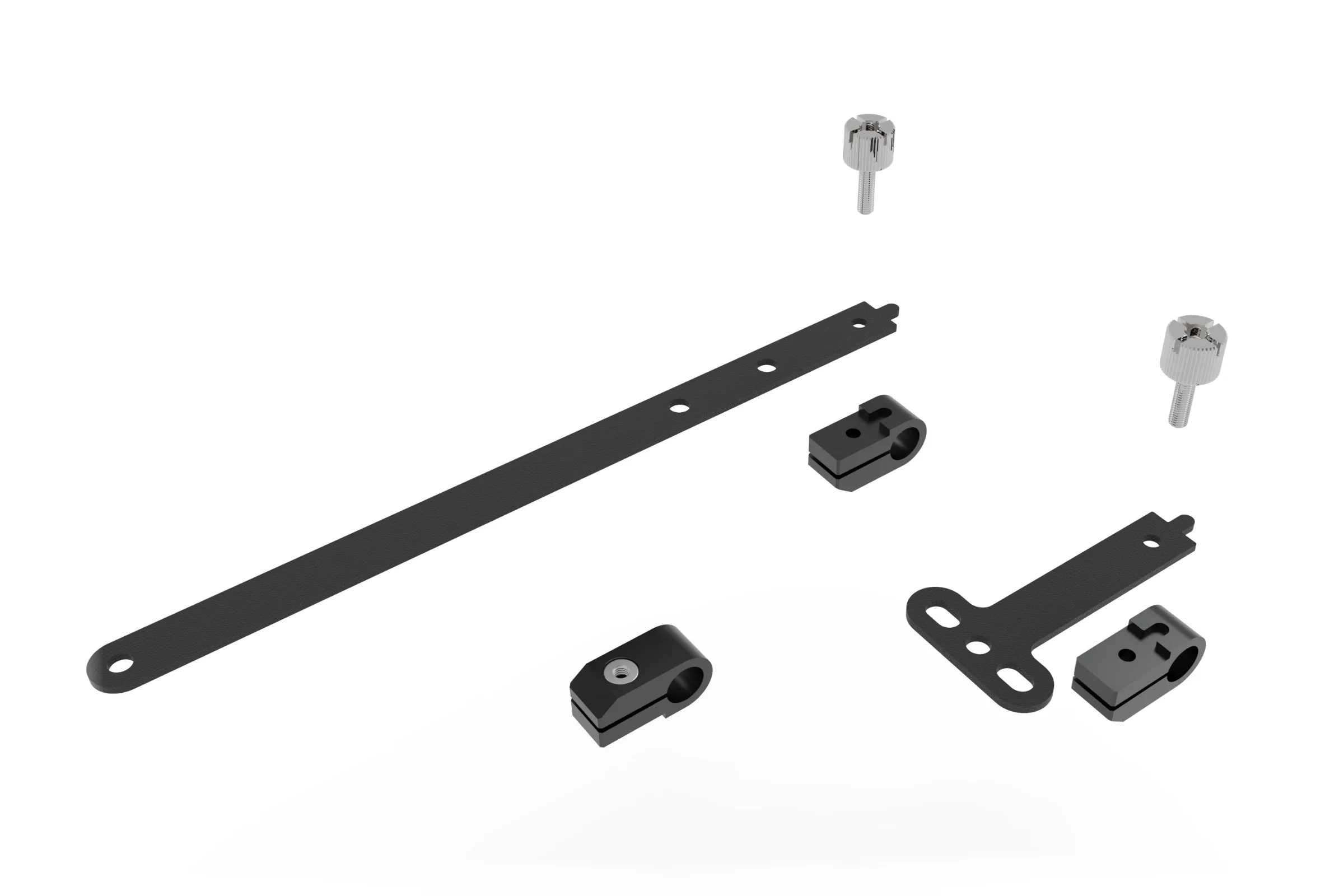 The clamps are designed to attach the brackets to the rail and allow for granular adjustment of the position along the rail and rotation. A single M3 thumbscrew is used to both secure the bracket to the clamp and lock the clamp to the rail. The clamp also features a captive steel nut, this ensure that high clamping pressure can be applied by the Thumbscrew without concern of stripping the thread.