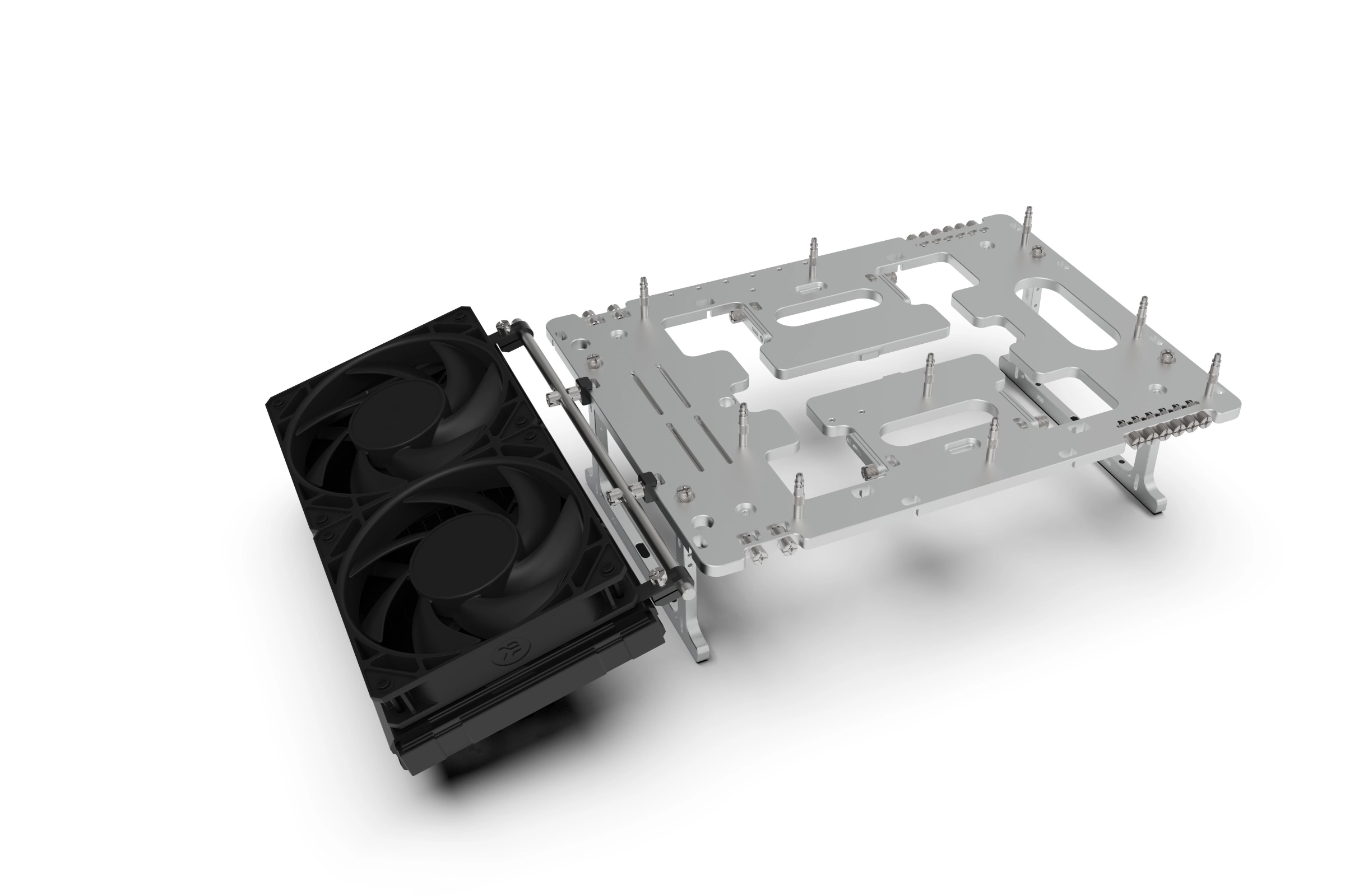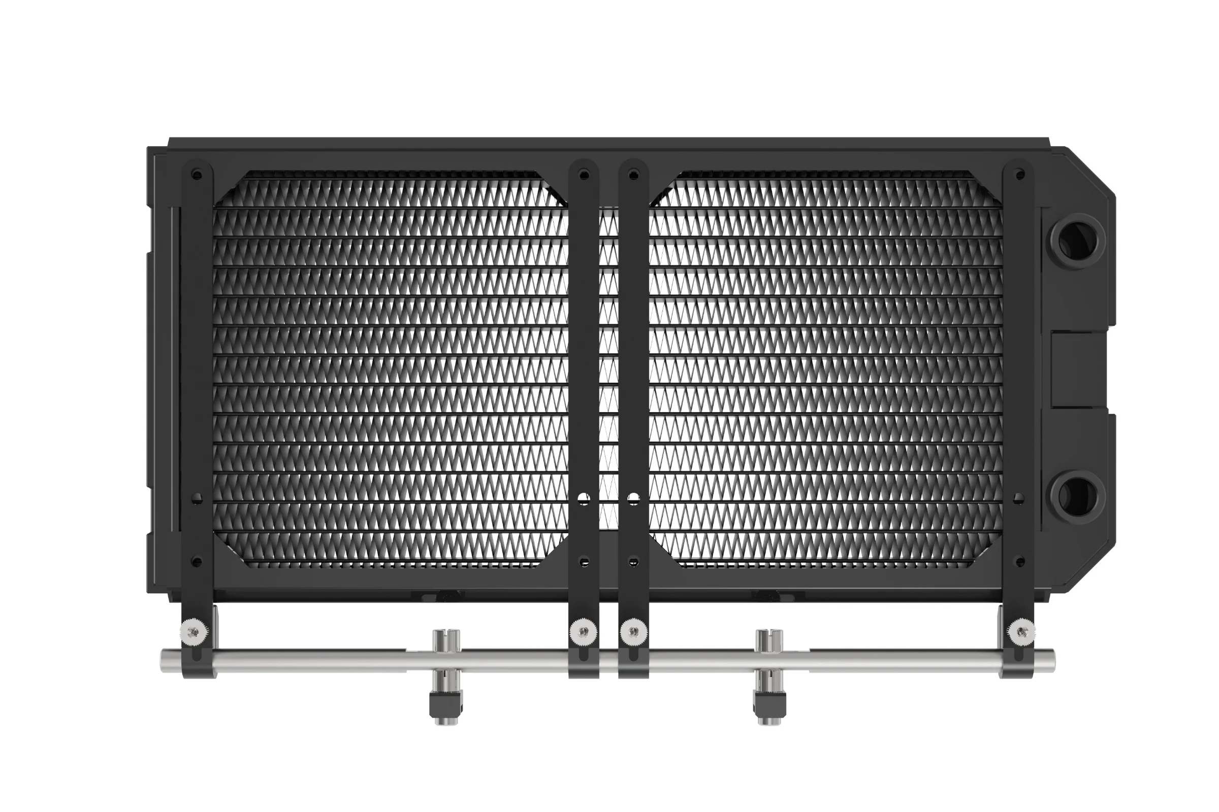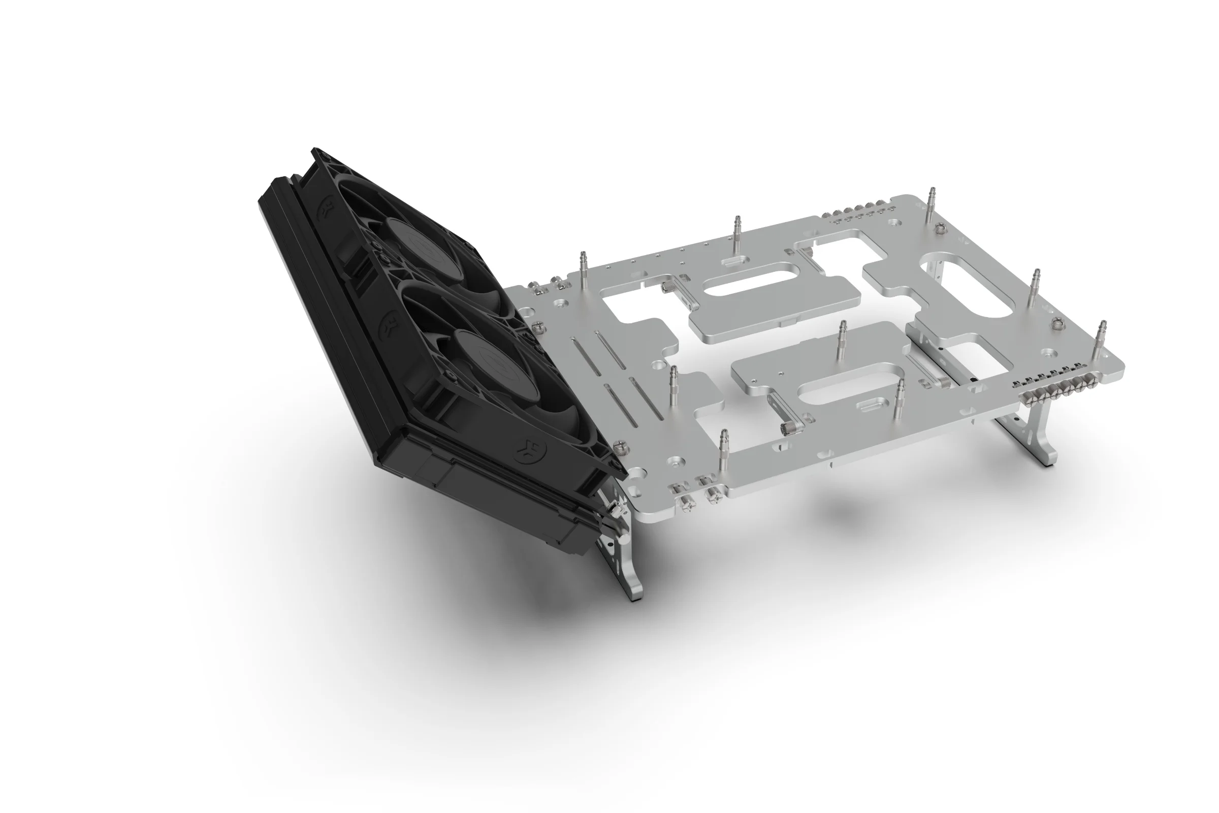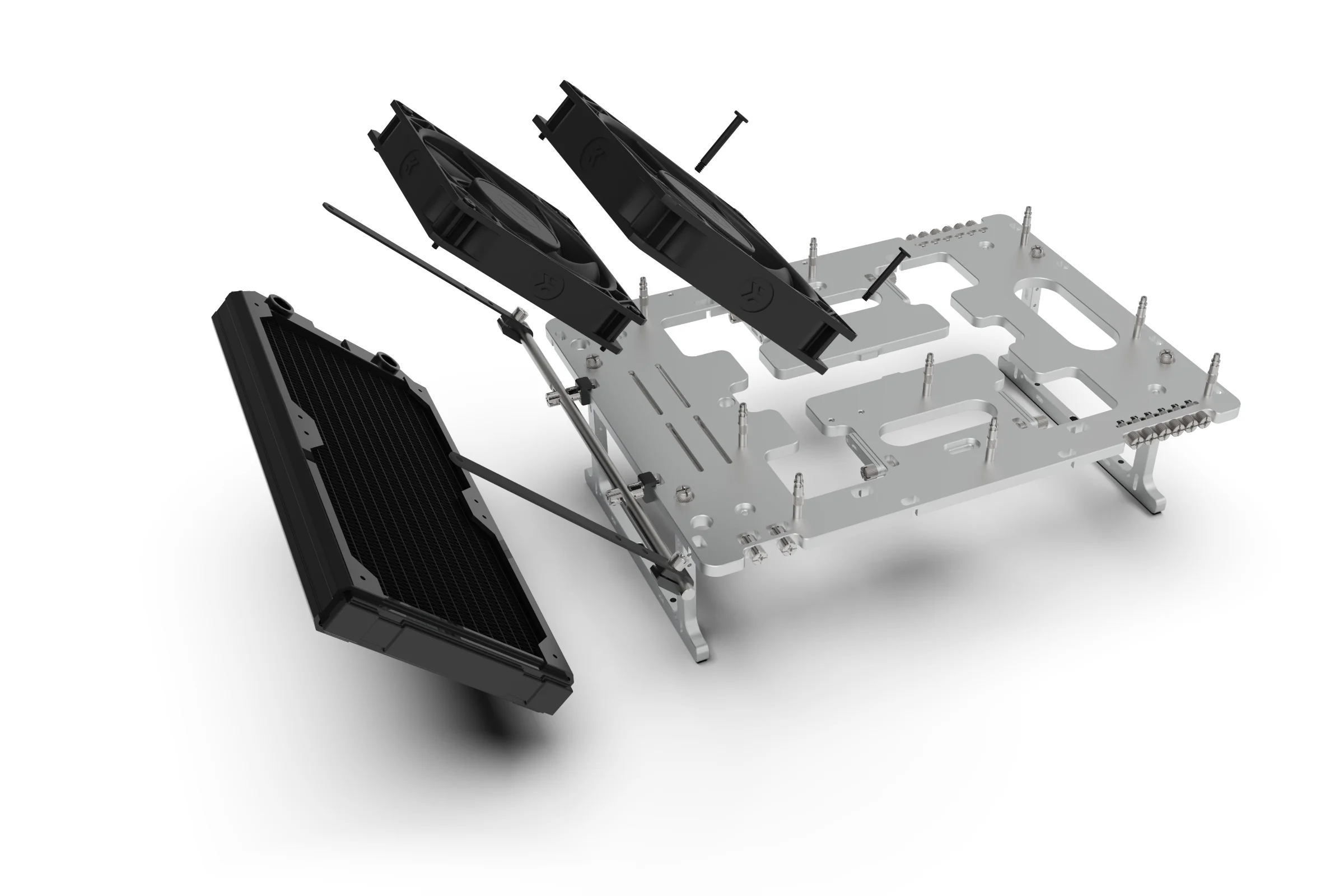 With the rail and clamps fitted, the final step is to attach your hardware using the appropriate brackets. For the procedure below we will use a 240mm radiator but the exact same principle applies for other accessories.