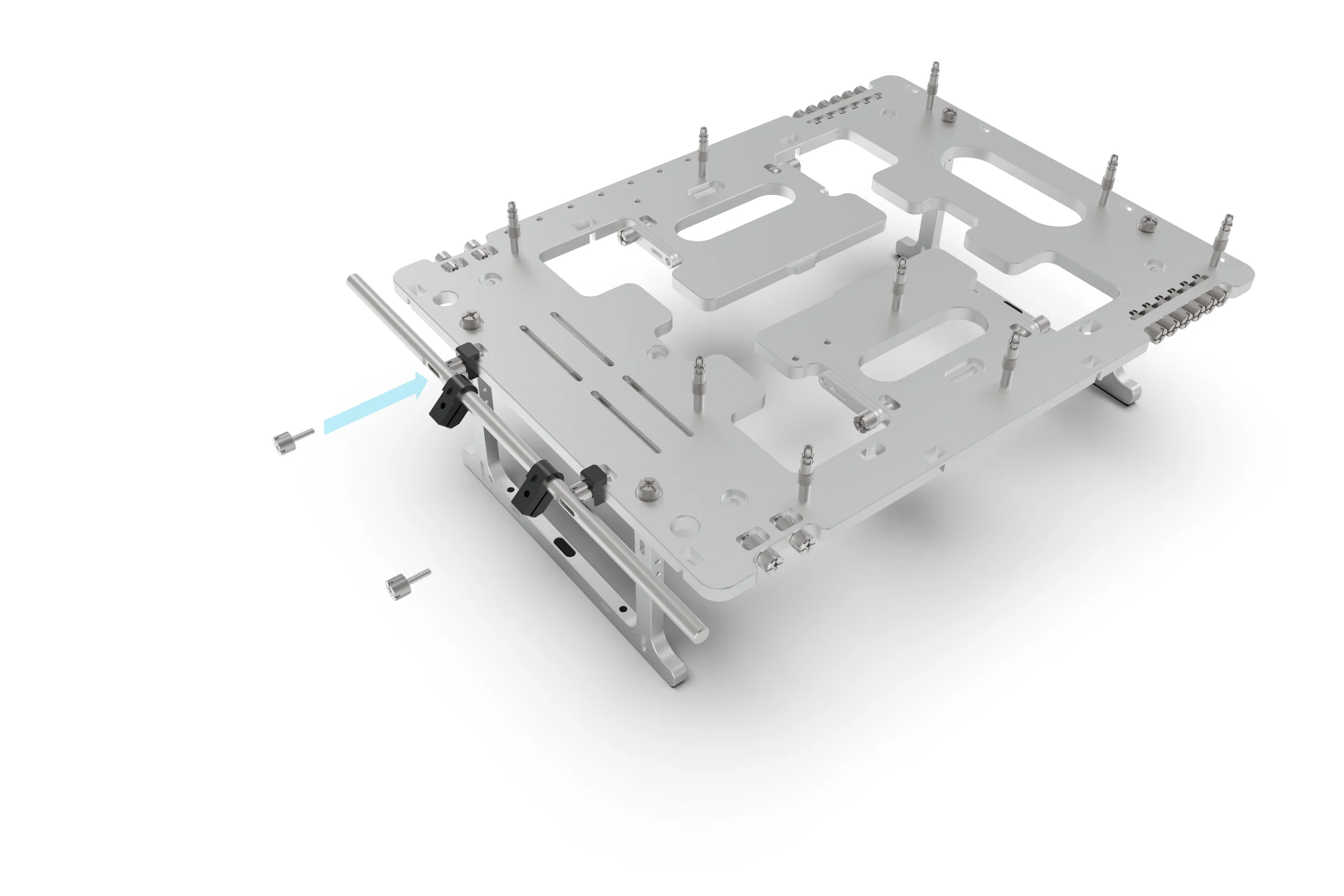 Depending on the hardware you are fitting, it can be easier to install the bracket to the hardware first, then attach the brackets to the clamps, but in this example, we will attached the brackets to the clamps first using the M3 thumbscrew. At this stage the screw only need to be hand tight so that the clamp is still able to rotate and slide on the rail.