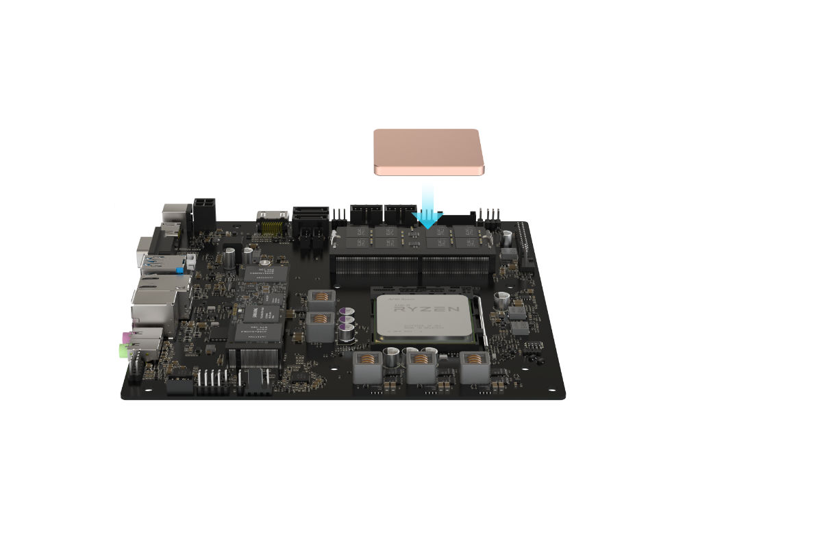 One of the requirements that define a Thin-ITX motherboard is the CPU location which should always be positioned as shown. This is a key feature that allows the DB1 Max heat pipes to avoid conflict with any components and connect to the heat sinks on both sides of the case.